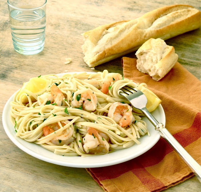 My go-to quick dinner is often times Shrimp Scampi with Linguine. I'll fix it on a Sunday night after we get home from traveling over the weekend, or a quick dinner for one if Mike is out of town. It is one of my favorites to fix for company - it somehow seems elegant, but costs very little to make ($15 for four people) and takes 10-15 minutes. Boil some water, saute garlic and shrimp, serve a salad and some crusty bread... done!