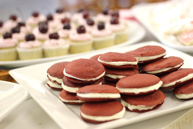 On the menu : Quiche (3 varieties), Honey Baked Ham, Spinach & Strawberry Salad, Baked Mac N Cheese, Cinnamon Rolls, Red Velvet Whoopie Pies, Cherry Almond Cupcakes & Sugar Cookie Favors