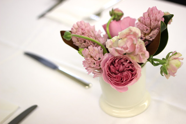 On each table we placed casual coffee cup arrangements of garden roses, renunculous, hyacinth, magnolia leaves and tulips. More flower details later this week with DIY (here it is - the link to the DIY Flower Arrangements!).