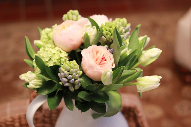 Didn't he do a great job? White parrot tulips, purple hyacinth, peach garden roses and green viburnum.