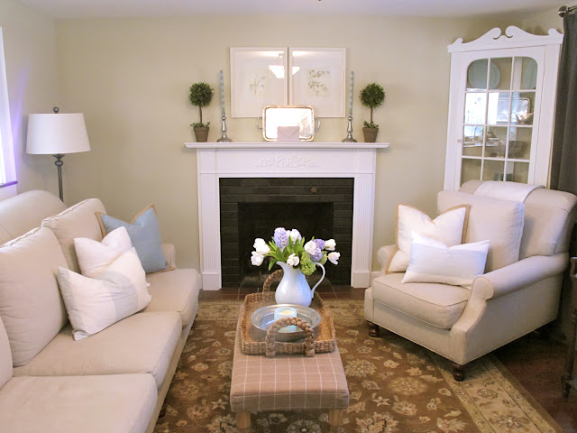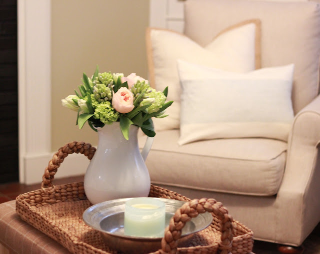 I had plans to over the ottoman, too, because I thought it was too dark and heavy for Spring. Once I put the new pillows in place, the room already felt so much lighter that I didn't need to do the ottoman.