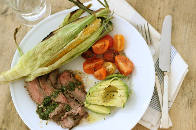 If you need a little inspiration, here is a great summer meal with Sliced Flank Steak with a Chimichurri Sauce, slice heirloom tomatoes and avocados.