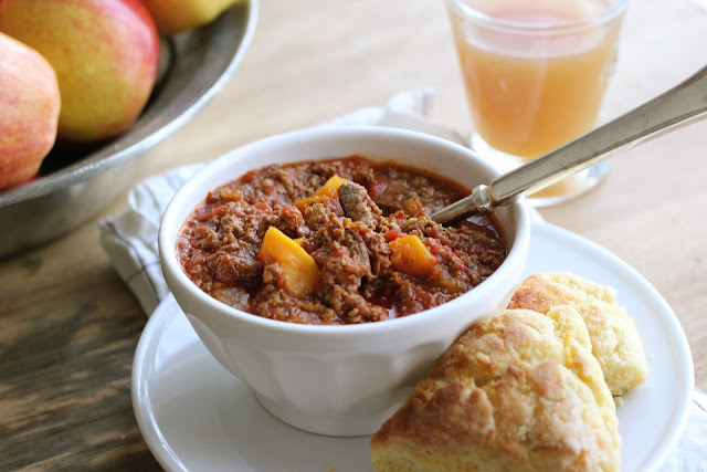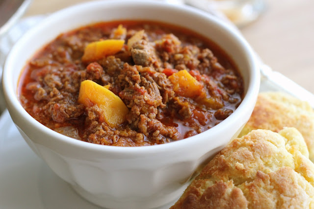 The slight sweetness of the butternut is great with the spicy beef. To add great texture and meatiness, I used stew meat that was slow cooked so it shredded apart... so, so good. To top it off, I served it with a White Cheddar and Jalapeno Scone.