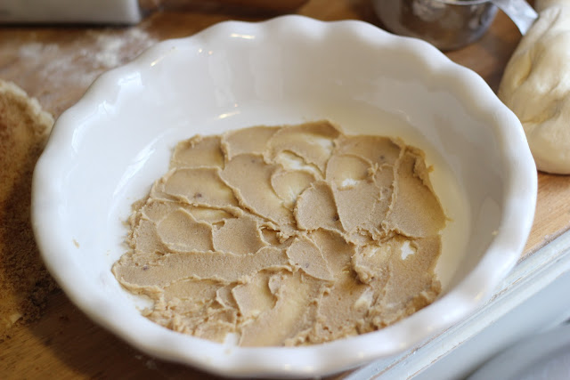 Create the schmear by creaming together 4 tablespoons of butter, salt and 1/2 cup of brown sugar. Scoop the mixture into the bottom of a round pie dish or baking pan.