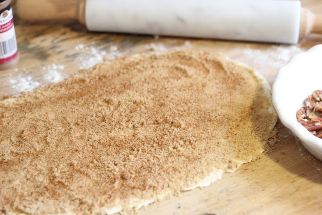 Sprinkle sugar, brown sugar and cinnamon over the dough. Roll up the dough into a log. Slice into 2-inch thick rolls.