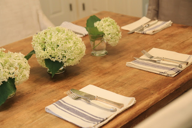 Our pre-Father's Day table set simply for a family dinner. I used the Fleur de Lys Tumblers as vases for single hydrangea blooms. I also used them for water and wine glasses that night.