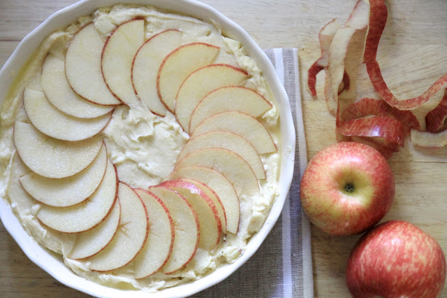 Tomorrow is the launch of the new Fall collection in my store. For a little teaser preview, today I'm sharing this Apple Cake in the new Creamware Tart Pan, $10. A little different from a pie plate, it is not as deep, but has a larger diameter.