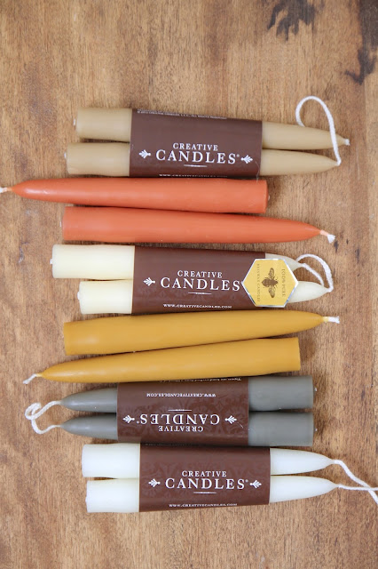 As you all know, I'm a big fan of Taper candles. I think there is nothing more elegant or classic than a hand dipped taper candle on a mantle or on a table. Typically, when I come across hurricanes they are for pillar candles. When I saw this pewter hurricane base for a taper candle paired with a tall thin glass sleeve I knew it would the be the perfect thing for our Thanksgiving table.