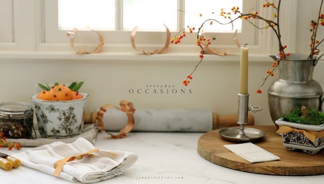 Thanksgiving is so special to me. As a home entertaining enthusiast, it is a holiday that embraces all of the elements I absolutely love - traditional recipes, classic decor, a cozy wood-burning fire, a big table filled with family in a warm home. We are hosting this year, the first in our new house. My mind is brimming with ideas for making it a special (yet simple) holiday for our family. I want to make sure our house is filled with traditional accents - piles of cloved oranges, bittersweet branches, pumpkins and gourds, lit candles everywhere, and of course, delicious aromas of the feast. I think about all of these elements when I put together this collection.