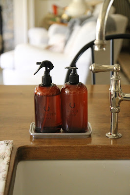 I'm introducing some new bottles today - The Amber Bottle Collection. I still love my clear, but this time of year I really like things that add a warmer feel. These amber colored bottles really warm up our kitchen sink, powder room and shower.