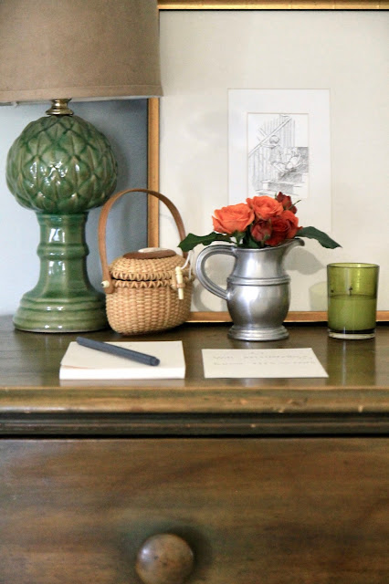 The Guest Room is the obvious place that needs the most care. You can see our entire Guest Room Tour, here. I've updated it for the season with a scented candle and some orange and rust colored roses. I try not to go overboard with "stuff" but I like a couple of considered items so make it feel cozy and homey.