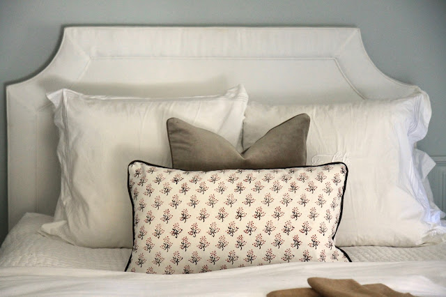 When you own a pillow store, your guests will likely expect to see some seasonal pillows spiffing up the room. I warmed up our all pale blue guest room with some velvet and print pillows. This is the Cashew Velvet Pillow + Red Berry Sprig Pillow.