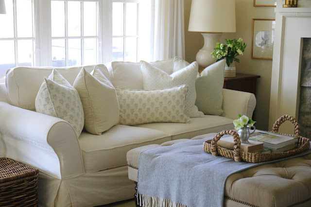 I tend to style sofas with two Large 22" pillows on each side to anchor, then two Medium 20" Pillows and a Rectangle accent. Here are the pillows I used here, left to right: