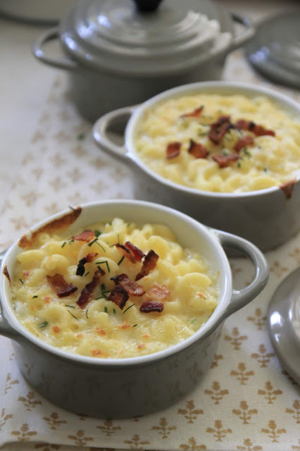 When I first spotted these Stone Baking Pots, I immediately thought of using them for hot dips like a spinach dip. Then, I thought, they'd be darling for individual soups and stews. Then I realized they were oven safe and thought of Mac and Cheese. I wanted to add a really, hearty fall flavor so I crumbled bacon on top. To counter the smoky bacon, I added fresh chives - it was such a good combination. Be sure not to go overboard on the bacon so the yummy Mac and Cheese really stands out.