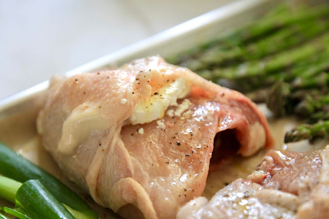 Sorry, closeup photos of raw chicken isn't always the best, but I wanted to show you how easy it is to slide a slice of goat cheese under the skin of a bone-in, skin-on chicken breast.
