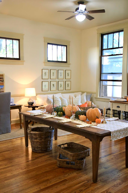 On the other side of the hearth room, the dining room is set (for the moment!). I just piled tons of pumpkins down the center and lots of taper candles. Such an easy and bountiful tablesetting - no floral arranging skills necessary.