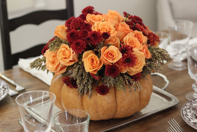 I love traditional Thanksgiving - everything. Traditional colors, a traditional menu, flowers, table setting, etc. I'm not sure if creating a floral centerpiece in a pumpkin would be traditional in the eyes of generations past, but in the Martha Stewart era of holidays, it surely seems like a classic.