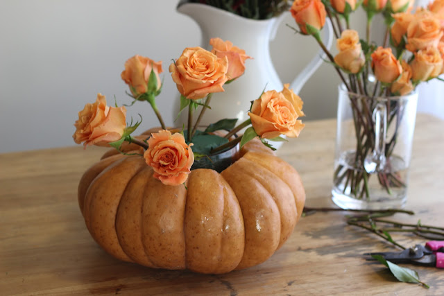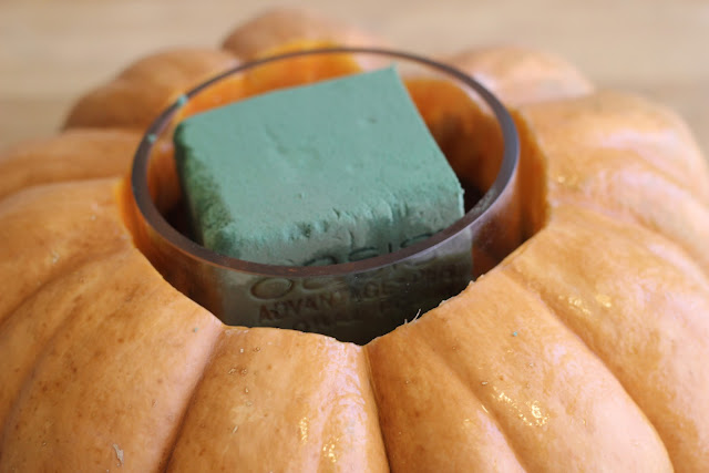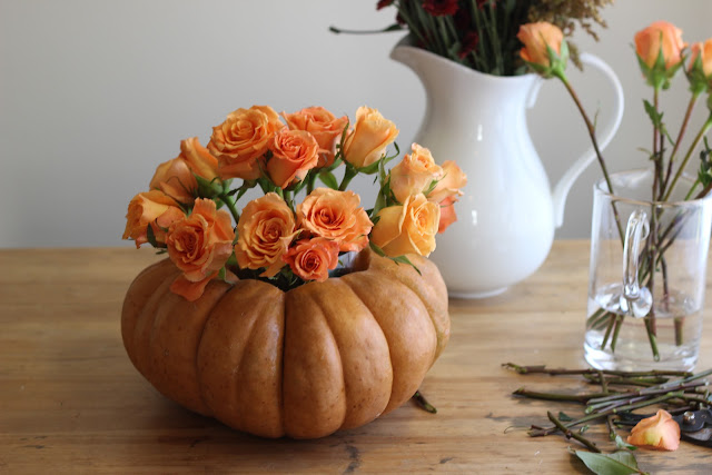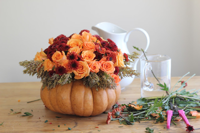 It has been about 6 years since I created a floral centerpiece in a pumpkin... I am not sure if I thought it was too over done, or if I hadn't had the occasion to do it. Or maybe I got lazy and didn't want to go to the trouble of carving out the pumpkin. This year, I've been itching to do it. I thought about if for Halloween, then Emma's costume took priority in the project department.