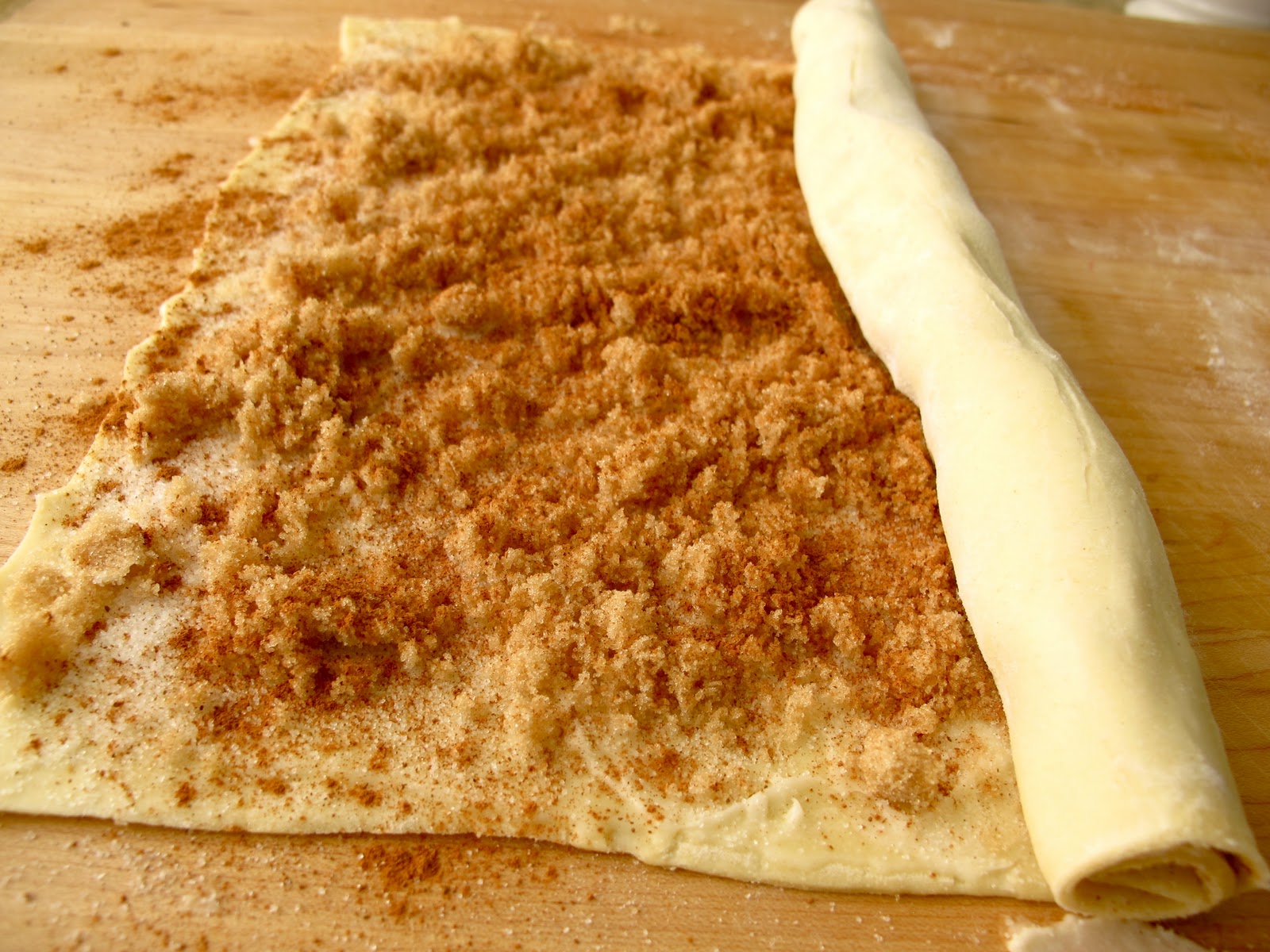 Fold the Puff Pastry sheets out on a lightly floured surface. Spread 1 tablespoon of softened butter out onto each sheet. Next, spread half of the 1/4 cup of sugar and 1/2 cup of brown sugar onto each sheet. Sprinkle 1 tablespoon of cinnamon onto each sheet. Roll the sheets into long rolls, then cut them each in to 6 even pieces.