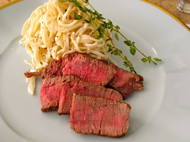 This is our favorite dinner - balsamic vinaigrette tossed greens, seared steaks and truffled mac and cheese.