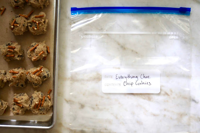 They could eat chocolate chip cookies, boxes of brownies and plain chocolate cake their entire life and be fulfilled. It makes it hard for me to want to come up with new recipes when they always ask for the classics. However, when Emma was at school this week, I took it upon myself to experiment. I started with their favorite chocolate chip recipe (tollhouse, but I use a little extra brown sugar and a little less white to make chewier) and added lots of yummy things - PB Chips, Chocolate Chips, Pretzels and Flaked Sea Salt.