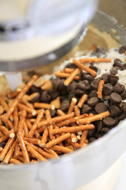 Begin by creaming together butter and sugars in a mixer until smooth, about 2 minutes. Add vanilla and eggs, mix again until smooth. Add in flower, salt and baking soda, along with chocolate chips, PB chips and half of the pretzels - reserve some of each type of chip from the mixture. I put them on top of each cookie ball before baking to make them look extra loaded. Mix together slowly just until combined.