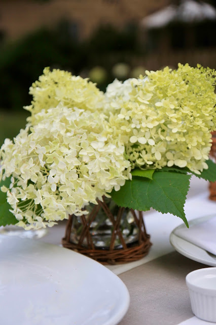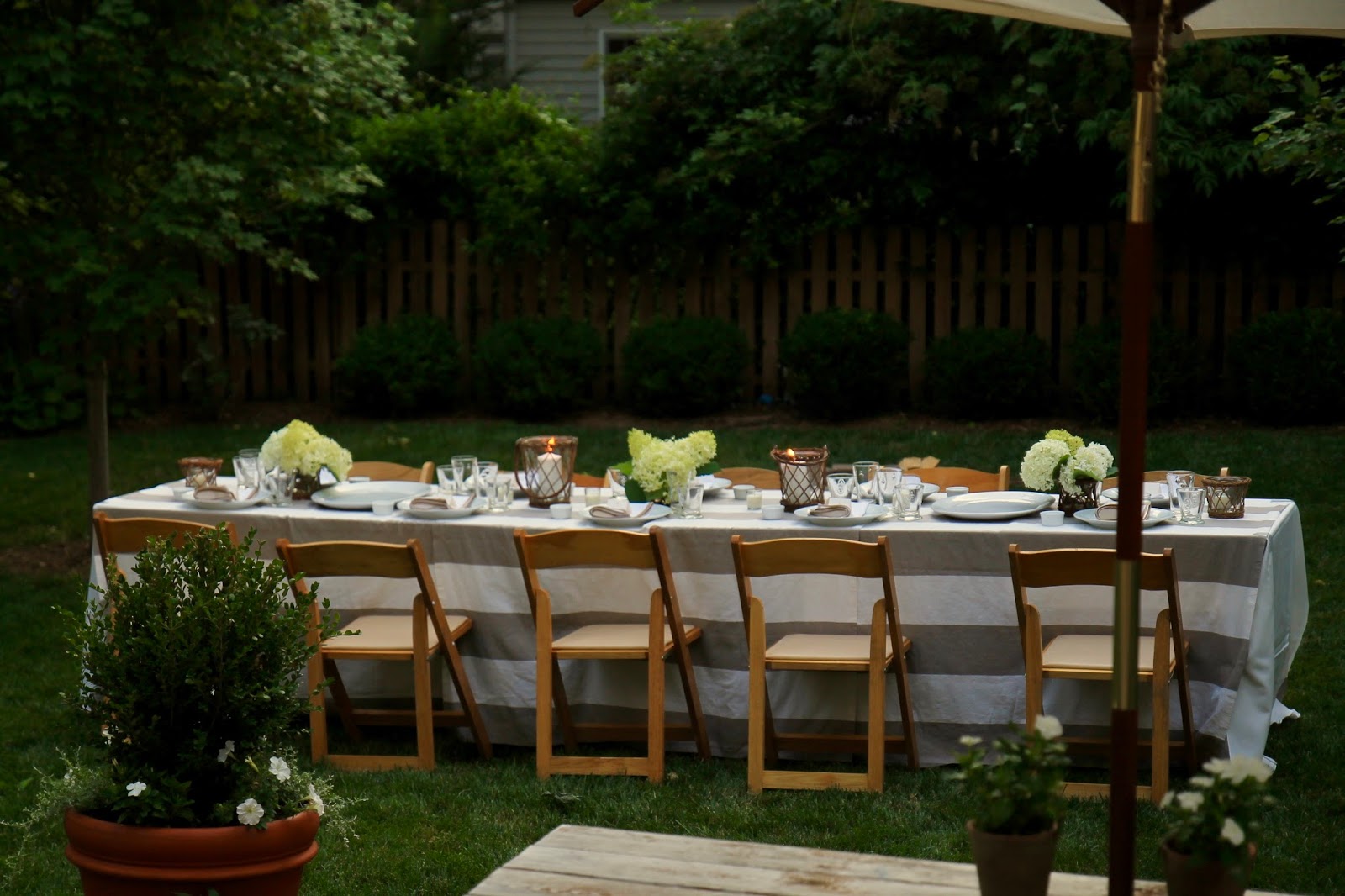This is the first time we've hosted an adult dinner party in our backyard, so I went ahead and fulfilled all of my outdoor entertaining fantasies. Flowers from the garden, candles everywhere, white and creams with accents of natural wood tones set in a lush green yard.