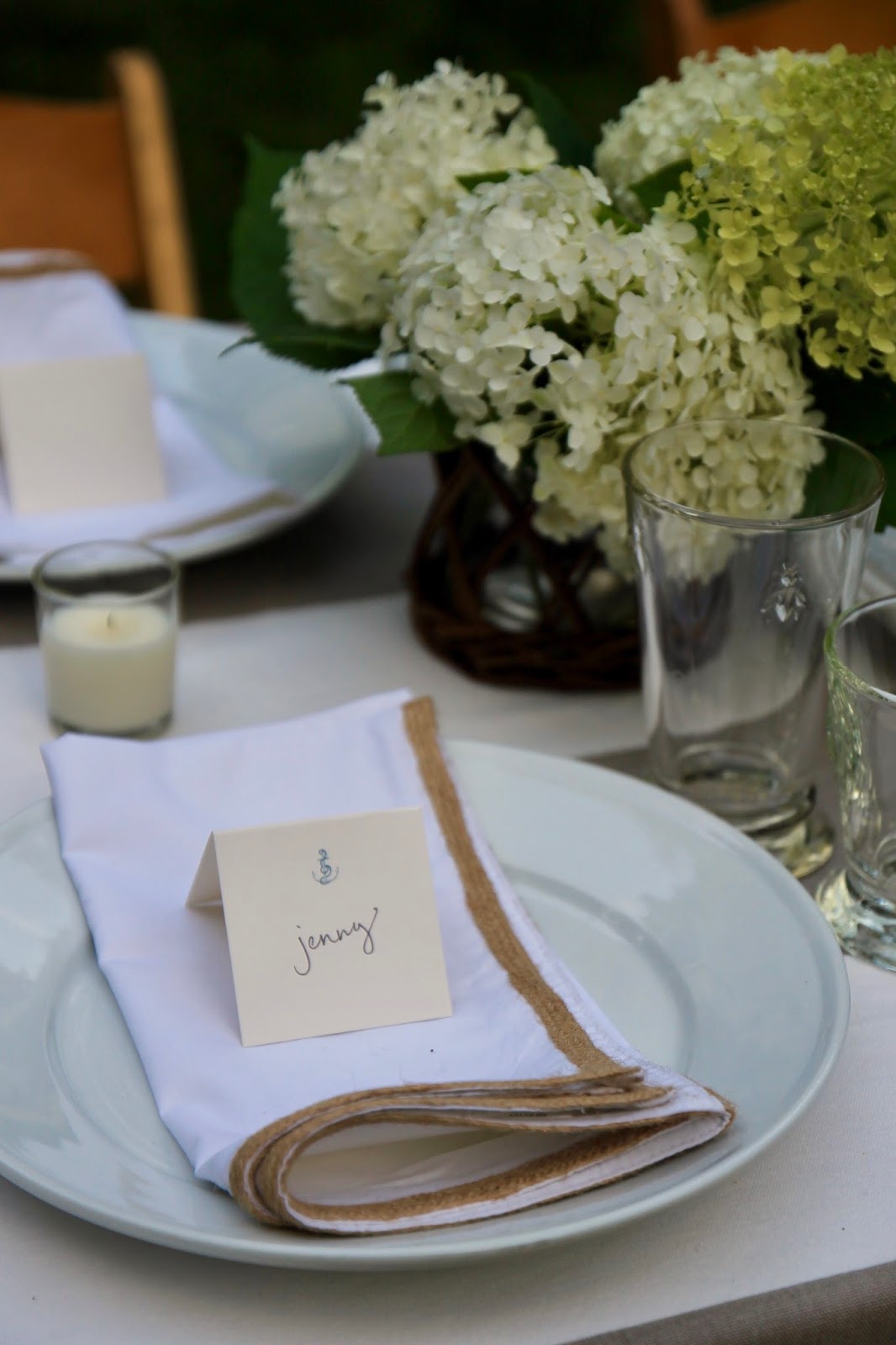 The table has a slightly nautical feel, thanks to the Anchor place cards, but everything else was simple and neutral.