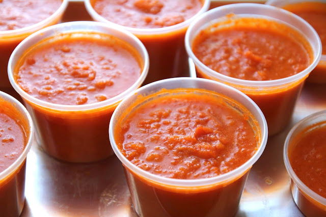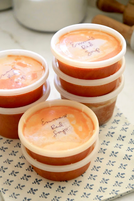 It is one of her favorite lunches to take to school. I send the soup in a small thermos and a bag of sliced baguette. Since we had an abundance of tomatoes this summer (from our 16 plants!!) I made some big batches of homemade "red soup." (I also made Garden Tomato Sauce, recipe here >)