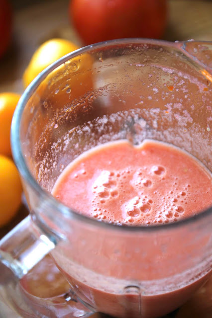 **If using fresh tomatoes, remove the core, cut into quarters then blend until liquified in a blender or food processor. If using canned, just pour them right in!