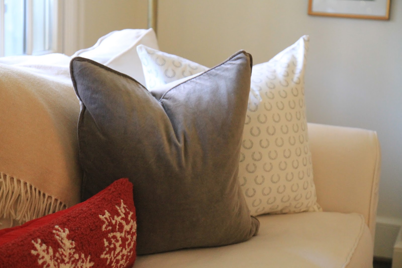 Pillows & Throws (Left to Right) : Heathered Grey & Cream Throw, Amber Velvet Pillow, Family Tree Hooked Pillow.