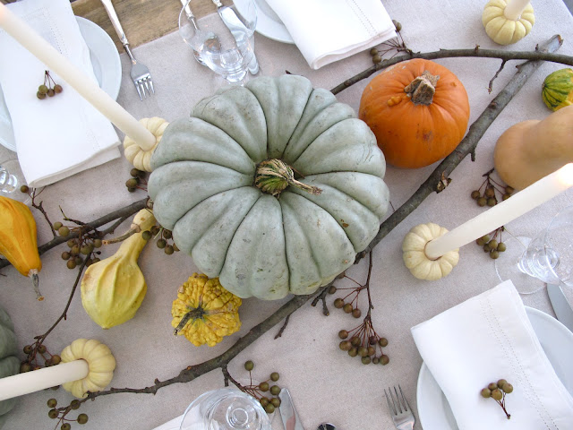 - 2 or 3 medium blue pumpkins: If you are seating 6, place 2 medium pumpkins down the middle of the table, placing them in the gaps between the place settings. If you are serving 8, use 3 pumpkins, placing them in the space between the place settings.