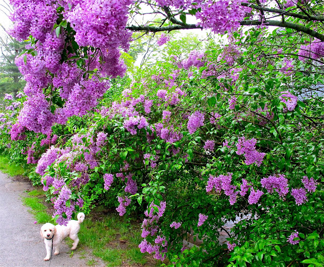 Today, on our morning walk, Mr. Darcy and I decided to stop and smell the flowers. He was attracted to the pansies and pussy willows at the Mainstreet Cafe, while I was drawn to the lilacs. I've been meaning to photograph the lilacs for a week or so, but the weather hasn't been cooperating. With rain in the forcast for the next five days, I decided to just go for it. Concord, being an old town settled in the 1635, has many old neighborhood streets and homes that remain from the Colonial and Victorian era. Lilacs were especially popular in the Victorian era and were a staple in landscape and garden design. In today's landscapes, they seem to have lost their popularity, unfortunately.