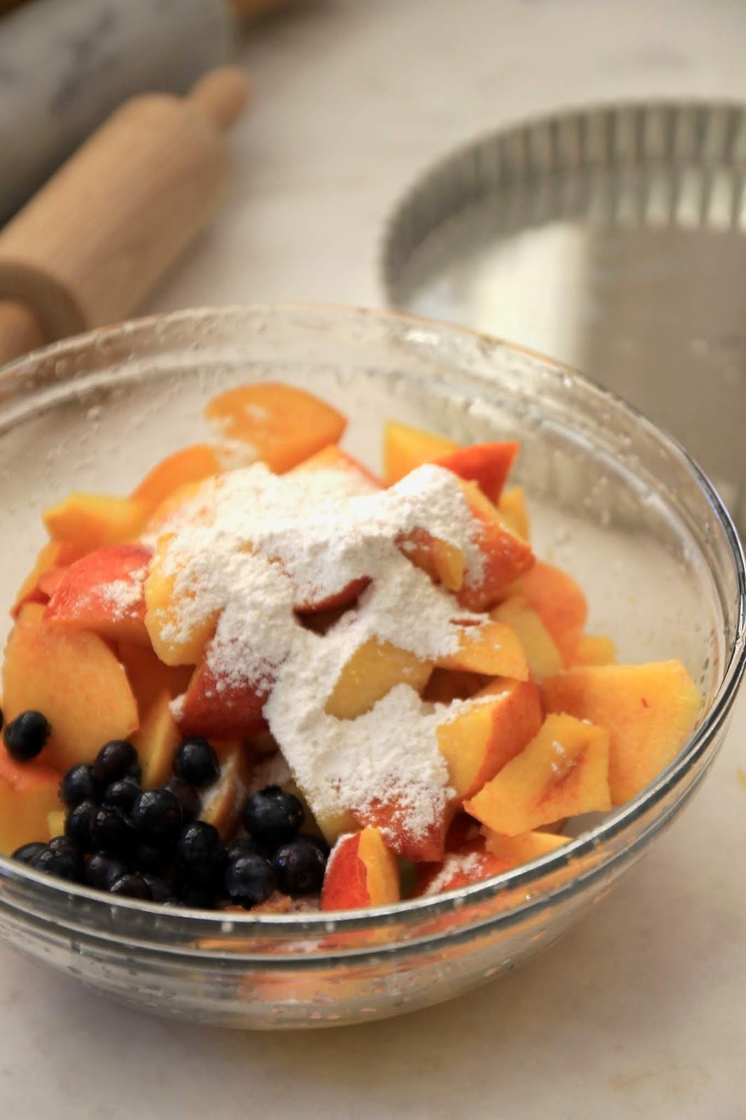 In a large bowl, mix together cubed peaches, blackberries, lemon zest, juice, sugar and flour. Mix until combined.