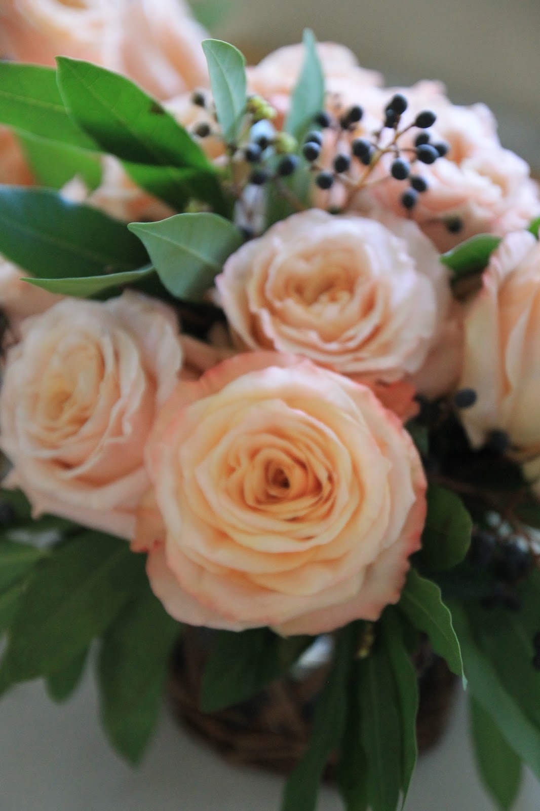 I used these flowers as color inspiration, but they also remind me of Peonies - especially the tip with the dots in the middle! I love the soft peachy, pink tone. Also, I love the muted olive green of the bay leaf I used. You could also make a deep navy blue to mimic the privet berries, but we used the real ones to garnish. Actual blueberries would look darling, too.