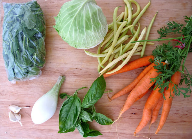 I will not pretend that we eat healthy all of the time (you've seen those Oreos on my Instagram!), but this vegetable soup is actually delicious. The only tricky part about this is that it is never the same. This is the soup that I make at the end of the week - usually on a Thursday or Friday afternoon. I make it from all of the vegetables that we have in the fridge that won't get eaten. You know, because it is going to be the weekend and we'll be eating pizza and Oreos. It takes about 30 minutes to make. I make it as big as I can and put it in individual freezer containers so I can get them out for lunch, or a quick dinner. These work great when Mike is traveling. Sometimes I get a couple of meatballs out of the freezer or add pasta or tortellini to it for a little more oomph.