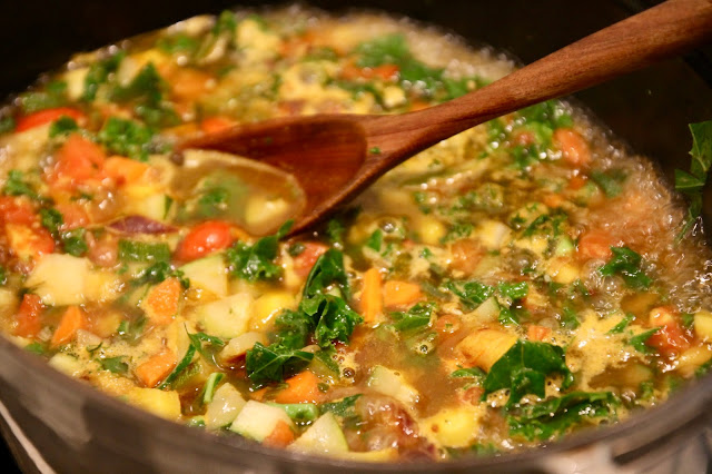 Begin by cooking the onions and bacon together until soft and fat rendered. Add carrots. Cook until they begin to soften. Repeat with zucchini. Add salt and pepper. Add tomatoes and fresh herbs. Add chicken stock and bring to strong simmer. Add kale. Taste for seasoning. Simmer until vegetables are soft.