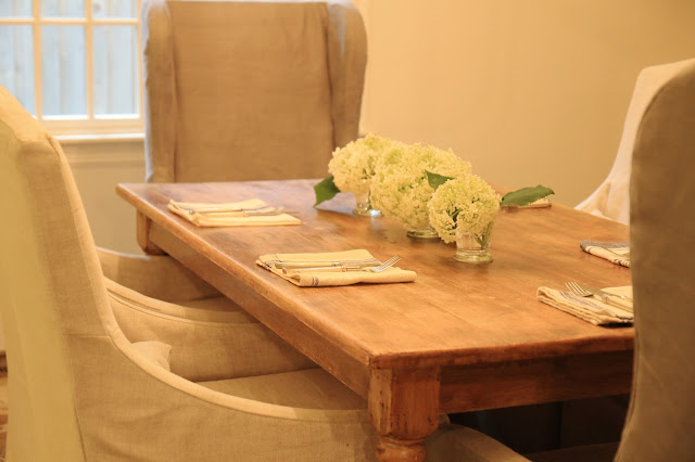 I mixed and matched various linen and unbleached blue napkins and I mixed our new Ivory Flatware with my old Pewter Flatware. Emma set the table : )