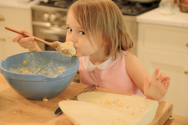 Here is Emma helping me mix and spread/taste the cheese mixture for the bread.