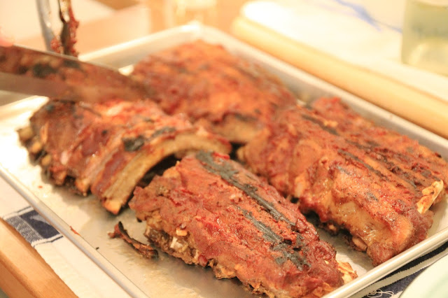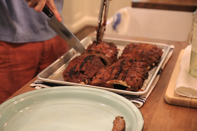 I slow braised the ribs in the oven all day (followed this recipe) and then we slathered sauce on them and finished them on the grill for just a couple of minutes.