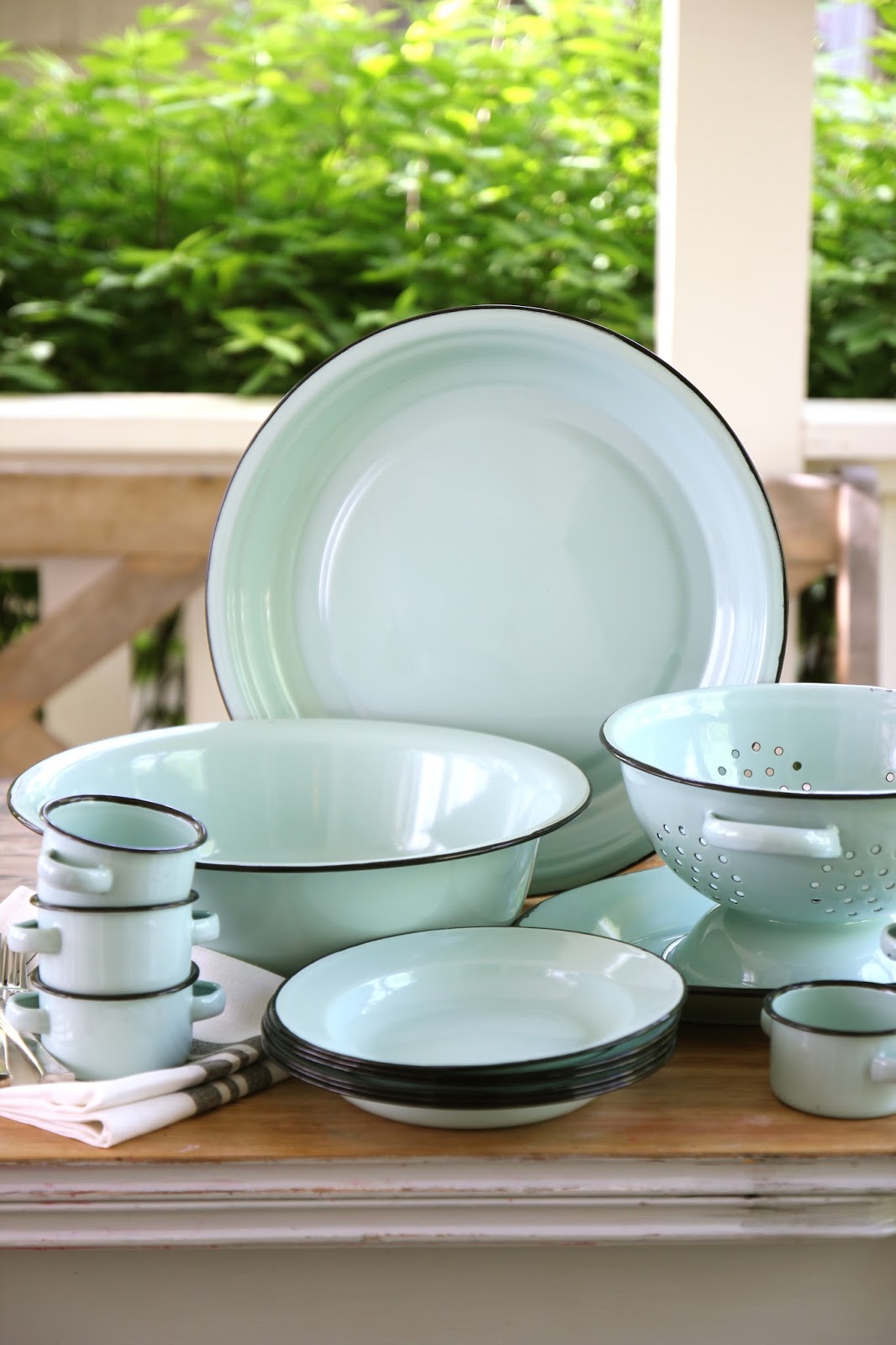 As you can see left to right : I set out plates, a Blue Enamelware Platter for Ribs, Cheesy Bread on a baking sheet ready to go in the oven (and then on a Wooden Bread Board for serving after oven), big salad ready for dressing, then skillet with creamy cilantro corn. I put all of this out before everyone arrived to make it easy on myself. I used an assortment of Natural and Blue and Navy linens under each platter to protect the counter.