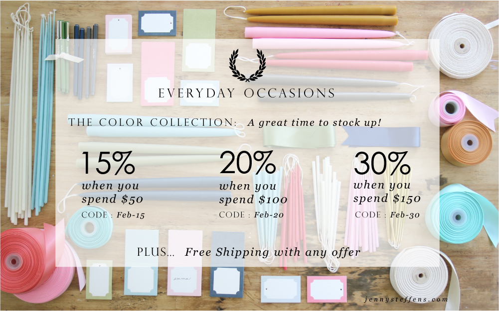 Colors : I like to choose 2-3 colors. The flowers are usually the most vibrant (or the white element), then I pick a neutral and a complimentary tone. While you can get all matching elements for a party (pink ribbon, pink candles and pink stationery, for example) like I showed in my post yesterday, I also like to mix and match the coordinating elements to create a more grounded look.