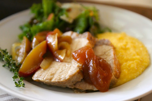 There are a couple of secrets that you must do to experience all it has to offer. 1) Salt the pork 2 hours before cooking - and use lots of salt. It really makes the dish very tasty. 2) Serve with Apple Butter. The pork, apples and onions become very salty, and the sweet, cold apple butter does amazing things when dolloped on top. 3) Serve with Cheddar Grits. If you've never made grits before, don't worry, they are so easy. The creamy, savory taste is amazing with the salty, sweet pork. Finally, 4) Serve with the Autumn Harvest Salad.