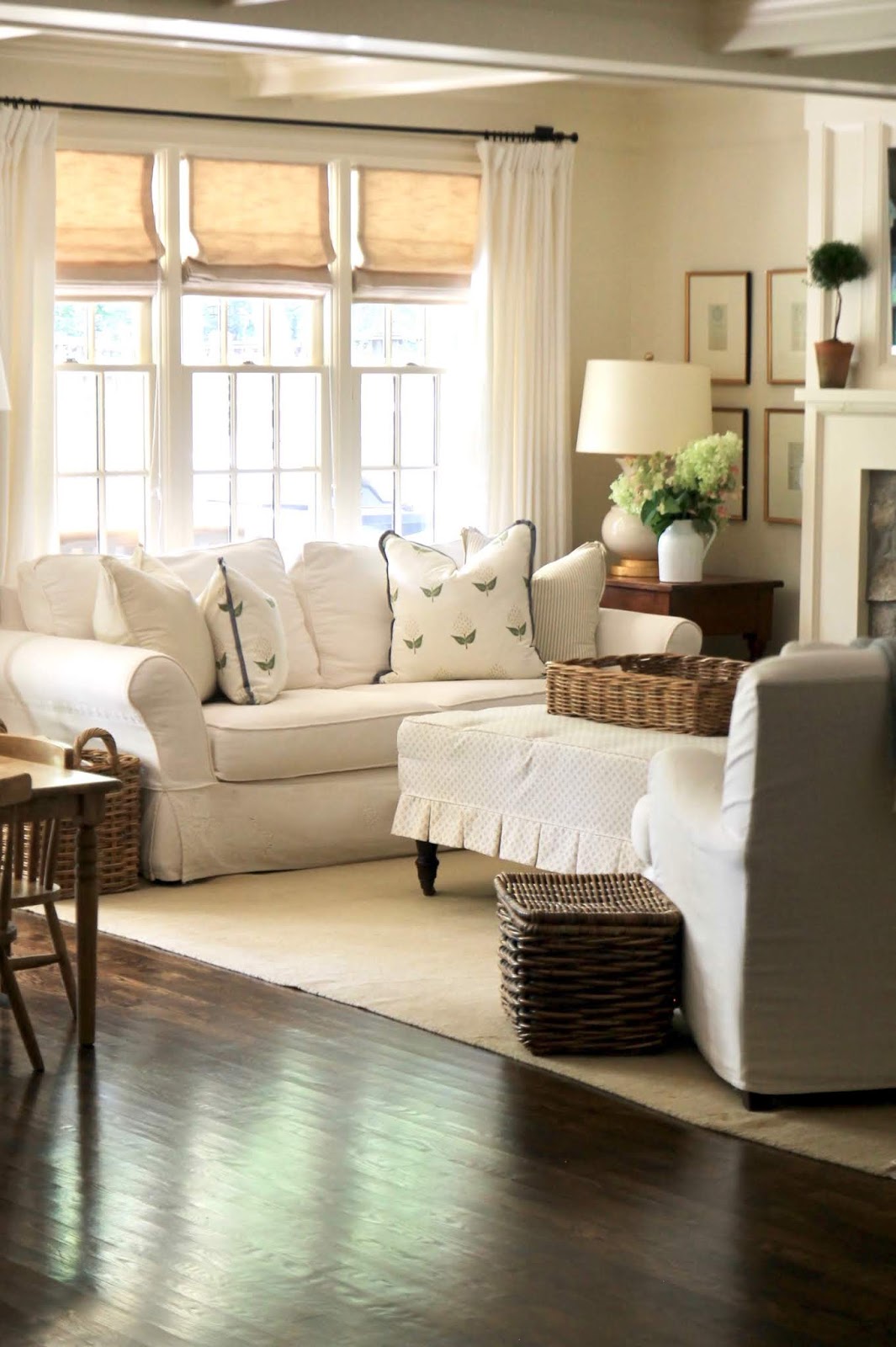 The hearth room is feeling bright and fresh with the slate version of the Hydrangea print.